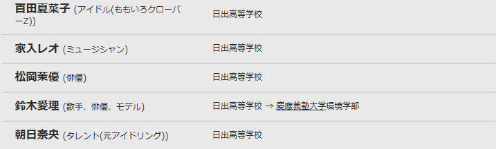 - 日出高校(現・目黒日本大学高等学校)芸能コース出身、松岡茉優・百田夏菜子らと同級生